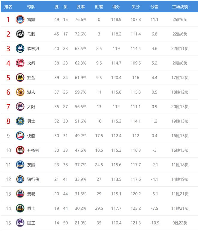 今日比賽后火箭、森林狼排名互換,其他西部球隊(duì)排名不變。