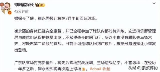 北京時(shí)間3月10日,根據(jù)媒體人趙探長(zhǎng)發(fā)文:崔永熙預(yù)計(jì)將在3月中旬回歸球場(chǎng)。